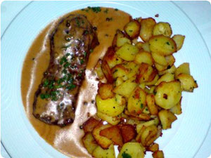Was kam war ein Steak, das besser noch etwas mehr Hitze gehabt hätte, in einer altbekannten Pfeffersauce schwimmend, hier etwas fade im Geschmack, die mit etwas zu wenig Pfefferkörnern gesegnet war und guten Bratkartoffeln, die leider unter etwas wenig Speck und Zwiebeln litten. Preislich und mengenmäßig gestaltete sich auch dieses Gericht ortsüblich.